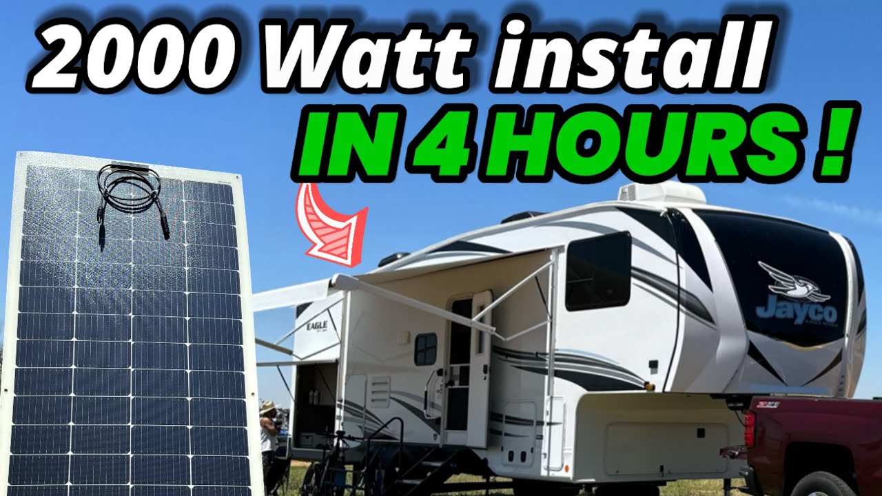 in today's video I'm going to show you this 2000 watt solar install I recently did on my RV and also show you how it's powered this new design 200 watt flexible solar panel was recently released a few months ago from renegi this is a newer design from their 175 watt panel it's been very popular the new one now uses half cut cells and nine bus bars which this is pretty much the same technology that you'll see in the same residential panels that we have in our shop that is installed on homes and businesses and more the older 175 watt panel had plastic beads that helped absorb light the new panel does have the same plastic beads in it but not quite as prominent as the older one the new panel comes in at three times the thickness which does make it a little bit more rigid and should make it more durable now before installing any of these solar panels I pulled out all 10 to make sure that none of them were damaged to make sure that the cords and connectors were good and to make sure that the open circuit voltage was relatively close between all 10 of these solar panels now after doing an alcohol prep I used 3M VHB double sticky tape this allowed me to Mount the solar panels to the roof of my RV very easy I also did each one a little bit differently depending on the slope of the roof this would allow any drainage of water that collected and also air to be able to get underneath the panel and I will have a link of this down in the description below now before I mounted the solar panels I washed the whole roof of my RV and then I brought up one solar panel and made marks along the roof with a pencil to get an idea of where I was going to mount these I also did another prep with alcohol on the roof to get off any last residue that way the 3M double-sided tape could have a good chance to adhere to the roof properly and to make sure that these aren't going to fly off when driving down the road now honestly one of the hardest parts about this was removing the red backing from the double-sided tape sometimes it was hard to get it started to peel off but once you got a little corner started then it would peel off easily but try not to touch the exposed tape this way you don't get any oil residues on it and that way you make sure you get good adhesion and it stays properly mounted on the roof now take your time during this because once you get it mounted it's pretty much not going to come back up I would butt it up against the next panel and then pull it back maybe a quarter inch to leave just a little bit of a gap this would hopefully allow water to run off quickly and not kind of stay pulled between the two panels now when pressing down on these panels just a medium pressure is all you need no pinpoint pressure and do not walk on these this could damage the solar panels causing arcing and causing you major problems down the road so make sure you inspect these every once in a while and do not walk on on my repeat do not walk on solar panels even rigid panels can be damaged okay well wiring right now so now you can see all the panels are down these five right here so we get our one two three and four or five right there those are going to be in series should give me 100 volts roughly at about 20 amps and then we'll have to kind of maneuver this way and then these five right here so there's your one two three four and this five right here I can't add another one there don't have enough room I can add one up there and one in the front maybe I'll do that later I don't know and then this one would join this crew down here for six and then six but again these ones will be in series same voltage and then they parallel in so just got to get everything wired up I'm kind of pre-wiring just to kind of see and plus when you guys are doing this you want to make sure you test your voltages too don't um just assume that everything is still good I've checked them already twice I'll be checking them again but uh because you know you get a bad connector maybe a bad extension that can save you some diagnosing later that way everything's putting out the same when you do both sides and everything's equal and even so I'll do some more wiring and I'll show you here in a minute what it looks like when we're done all right and this is about the finished product now this is about 95 done with any solar system that you put on an RV you sometimes start thinking about things that you would have done differently just because every layout is a little bit different but holding down just most of the solar cords is just going to be your your return of bond type tape and I did try to make it to where everything is still serviceable because you know when you get too much solar in the way servicing anything whether it be roof vents or your AC system and more it can be very difficult with all this in the way so I tried to make it as user friendly as possible so now being only about like I said 95 percent done I still have to change a couple things because I don't like this where my roof Inlet is I'm going to be taking that one off I'm going to turn it sideways because with your parallel connectors because I do have this running in two different series um I couldn't run through the actual roof mount so I ended up coming out here I still got to add my fuse real quick this was kind of like a a quick setup but I do have also a breaker downstairs as well with them being paralleled in again with those connectors it's a little bit of a pain in the butt but I'm also going to be adding another roof Inlet for one panel that'll go here because or it could go there but more likely here because this is going to be for the stock a system that's already on board this stock system from gopower was a pull Swift modulation so this is kind of older technology and this can't handle very much solar but this is what charged the house batteries so I am going to be adding one panel to this I'll bring this back online because as the solar wires came through they 