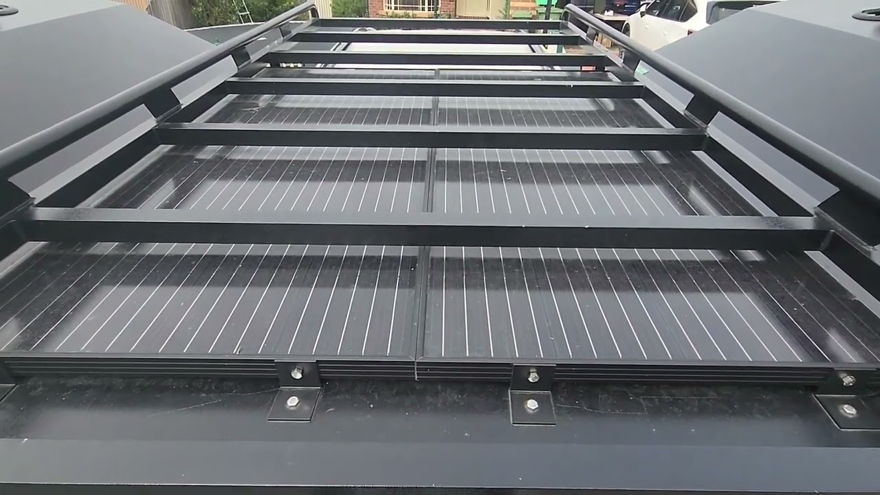 [Music] foreign [Music] guys just wanted to show you the two 180 watt inner Drive solar panels I got from my generator I've got them on top of my 1800 wide TC canopy it obviously tapers in as it goes up but the two panels work perfectly and they also fit underneath the roof rack that's provided by TC so we're not we've got use of the rack still also found that once I put them on the roof it actually kept the canopy cooler inside as a bit of an insulated barrier so the more efficient for the fridge and the pile warmer and over Easter with overcast conditions never drop below 80 with the battery so yeah they're doing a really good job I'd definitely recommend them foreign [Music] ...