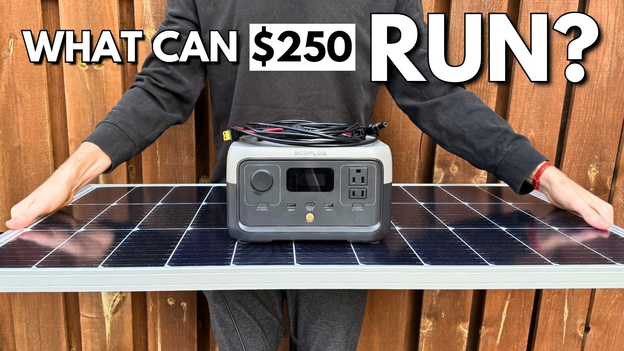 I'm giving myself a budget of $250 to spend on a cheap solar generator setup and we're going to find out what it can run and what it can't I know exactly what I'm going to get ecoflow River 2 that's where we're starting for me it was between this one and the blue edti AC 2A both seem great I don't think you could go wrong with either frankly but the ecoflow river 2 has a slightly higher battery capacity $239 but there's a $70 off coupon and it comes with a solar charging C that we need so I'm adding that to cart now we just need the solar panel and I think we could get away with a 100 watt solar panel this wouldn't be a portable panel because portable panels are just way more expensive the ecoflow river 2 has A10 wat Max solar input and this is what I wanted to see there's a $58 100wt panel that might be within our budget let's quickly make sure this solar panel is indeed compatible with the ecoflow river too so that uh Power station's solar input is 8 amps Max 11 to 30 volts 110 Watts 24.5 volts VOC that's within the limit and 5.2 amps ISC that is also within the limit so this very cheap 100 wat panel is compatible add to cart the subtotal is 297 but remember we have that coupon proceed to check out 256 you've got got to be kidding oh wait free shipping free shipping that's got to get us below 248 I feel like I just won something place order order placed I know some people will say it's just cuz I got a good coupon but if you have been seeing the sales and the deals on these power stations for basically all of 2024 and you know that is not abnormal and it's not hard to find that good of a deal on these things right now hell yeah everything arrived so let's unbox it I'm going to start with the solar panel to get it out of the way okay so it is a 100 watt believe it is yes monocrystalline solar panel from ecoworthy next I will do the adapter cable to connect the solar panel to the power station this is ecoflow branded simple but long which I like the ones I own of these are more like 2 feet so I'm excited that this is a lot longer and lastly the ecoflow river 2 portable power station got the manual here looks like a 12vt like car charging cord and then uh a little wall AC charging cord and of course the ecoflow river 2 power station quite small as we expected but looks like it has all the stuff we need before we see what this setup can run we have to charge it so let's solar charge it so it arrived 28% charged and then to solar charge it I just plug the adapter cable into the cables on the solar panel so I just match male to female mc4 connectors make sure this one connected and then I grab the xt60 port and I plug it in to the back of the power [Music] station and then after a second the solar pan panel should start charging we should see an input pop up here at some point still not seeing anything okay all right let's check and we're just going to check if this end of the adapter cable has voltage okay it does have voltage 22 volts okay the panel is in a bit of shade so let me move it out here and just see if that changes anything oh my God thank you I guess it was just shaded but it didn't wasn't even that shaded okay but there we go 62 WS charging from a 100 W solar panel it's actually not too bad I'm going to use this chair to prop it up at a slightly better angle to try to get the most power out of it as possible look at that 78 Watts I'm just going to leave this out for an hour and we are going to come back and see how much it charges in that [Music] hour another good thing about going with a brand name like ecoflow or bluetti or anchor is that they're going to have a good app so while I'm just inside cooking I can look at the app and see okay the solar panel is charging the power station at a rate of 74 watts in the power station is around 42% charged [Music] it's been exactly 1 hour and the battery is at 55% so this setup can solar charge the power station in 3 and 1/2 to 4 hours of good sun and solar charging is just one of four ways that you can charge this thing you can charge it from your car's 12volt socket using the included 12volt charging cable there we go it's charging at a rate of it's creeping up it's maxing out at a charging rate of around 100 watts of course you can also use the included wall charging cable to charge it from an AC outlet let's see how fast that is it's making a little bit of noise and the charging rate settle at 365 watts in the app if you want you can adjust the AC charging speed from 100 to 360 Watts so I'm actually getting a little bit higher than the max at 365 and you can adjust the car input charging speed if you want when you're charging it from your 12vt car socket and lastly this USBC Port is bire so you can charge via USBC there it goes charging it right of 17 wats I plug the AC charging cable back in and if you're wondering what this is this is estimated time remaining uh so it says recharge time there's 12 minutes until it's full the last five 10% has been taking a while it said 5 minutes remaining for about 20 minutes now and I did turn it down to 100 Watts charging speed uh just to just to you know keep the battery a little cooler but still it's been stuck at like 995 96% for a while so I don't know what's going on with this thing okay it took a little longer than expected but we got there now that it's fully charged let's see what it can run so it can obviously charge your portable electronic I like your phone your laptop portable power bank a pair of bluetooth headphones and it can power them all at the same time but I also want to push this thing to find out what its limit is for starters you have the two AC Outlets here which you can turn on and off just by pushing this button that turns on the power station's inverter so there is a bit of a high pitched woring noise that I can hear but what allows me to do is just plug in almost any device that you can plug in to a regular wall outlet and yes you can plug in two AC devices at a tim