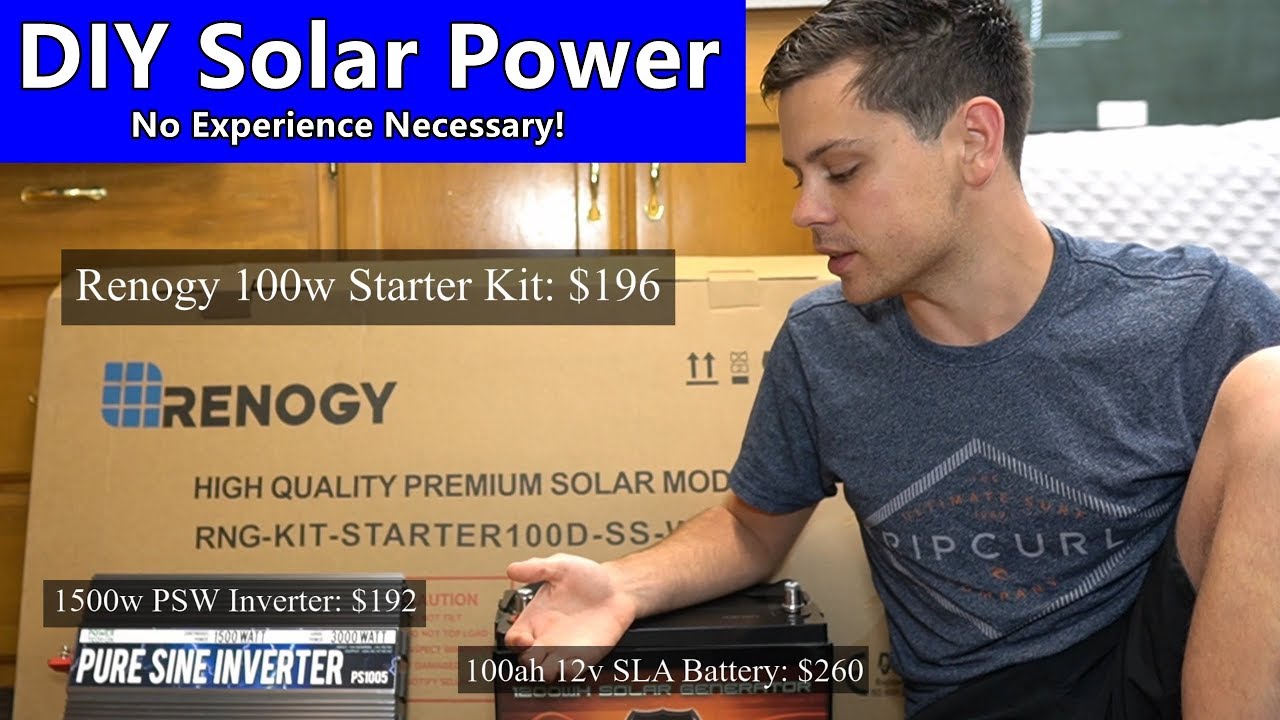 in today's video we're going to be doing a beginner friendly solar power system build and this is for somebody that has absolutely no experience building a solar power system we have a renogy 100 watt starter kit and this has the solar panels the wires and a charge controller and we are going to attach this to a 100 amp hour sealed lead acid battery which is ideal for solar power systems and then we are going to connect the battery to an inverter and this inverter will power your ac appliances that you would typically plug into your house outlet and once you build this system you can charge it with the sun and you can power your appliances and this is actually a pretty good sized system you'll be able to power quite a lot of stuff with it so yeah i hope you guys like this video and let's get started so first we need to take everything out of this box you're gonna have a solar panel and another box that has a lot of components for our system and this kit will come with four different wires and these ones with these little connectors on top these will connect the solar panel to the charge controller that this kit comes with and then from the charge controller to the battery they give you these wires and they also give you some mounting hardware for the solar panel the first thing we want to do when mounting this solar panel is add these mounting brackets and you want it in this configuration you have a bolt a washer a washer a locking nut washer and then the nut at the end so first the bolts in the washer and all this other stuff goes in the back you can use pliers or an adjustable wrench on the back and then use a socket on the front wiggle it around to make sure it's solid now the next step is to use the included screws in a drill and mount your solar panel wherever you plan to mount it you are going to have two wires on the roof of your vehicle or your cabin and what we want to do is connect these to the solar charge controller but before we connect the solar charge controller to the solar panel you want to connect this to the battery first because if this is connected to the solar panels you can burn this out so we're going to connect this to the battery first and then we're going to head back on over to the solar panel so what we're going to need are these cables and a battery so to connect this battery to the charge controller we're going to use this piece of wood and mount the charge controller to it and this should be very close to the battery now it's time to connect the charge controller to the battery with these two wires and in order to do this we're going to need a flathead screwdriver first rip off the insulation and the wire should look like this and if you look close at the charge control you'll see a battery icon and a solar panel icon go to the battery icon and there will be a negative sign so we want to unscrew the negative first and then you want to insert the wire where it says negative and then screw it down and then pull it a little bit to make sure it's tight now we're going to take this wire and run it to the negative terminal of the battery it will either show a negative symbol or it will be black and then tighten this down with a wrench and then repeat the process for the positive cable on the charge controller and when you're screwing these terminals down make sure that you hold on to the wire and you push it up because they like to slip out and then feel it to make sure it's strong and then you're good to go and then connect the positive wire to the positive terminal of the battery now that the battery is connected you'll see a green light illuminate this means that you did a good job connecting the charge controller to the battery so now we're going to use these wires and connect the solar panel to the charge controller and i like to do these one at a time so first we're going to take one cable and plug it into the solar panel you're going to have two connectors and this one is the negative and then the one with the red o-ring is going to be the positive so the first wire that we want to connect is the negative so plug this one into the negative and now that we have the negative we can connect this to where it says solar panel negative on the solar charge controller so again unscrew it all the way and then insert it and then screw it all the way down now we're going to take the positive solar panel wire and plug it into this wire and then connect this to the positive solar panel input on the charge controller and this is what it should look like with all four wires connected now i can put the solar panel in the sun and we'll see if this thing works and starts charging the battery and now the solar panel is outside make sure that is not shaded anywhere today is a cloudy day but we should have enough power to charge our battery and if you go back to the charge controller we have a green light at pv that means photovoltaic or the solar panel and if you have two green lights right here and one's flashing that means that you are charging and you are good to go and this third green light tells us that it's green for sealed and that means sealed lead acid and that's the battery we're using but if you need to change this you need to hold this button down for seven seconds five six seven and then when it's flashing we can actually change this one so green for sealed orange for shell battery and it looks kind of like a yellow and then if you have a flooded battery like some trojans then you put it on red if you have a lithium like a lithium iron phosphate such as the battleborn then you're going to put it on blue and once you're on the right color then you just let it sit for about 10 seconds and once it stops flashing then the settings are saved and right now this battery is charging but now we want to add an inverter so we can use the power that we store in this battery from sunshine and use it to power our appliances and so what we need to do for this step is actuall