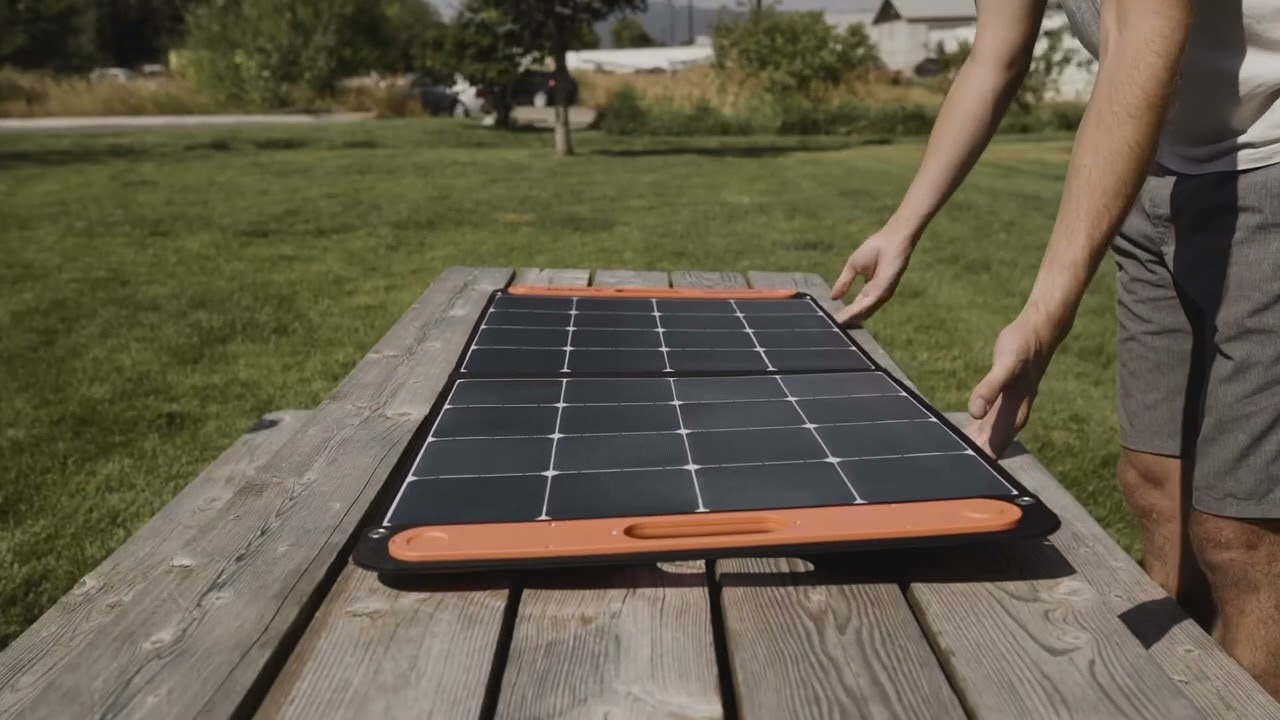 hello everyone this is an unboxing video of the jackery solar Sega 100 watt solar panel this is most compatible with the Explorer 500 the Explorer 300 the Explorer 240 and the Explorer 160. two of these solar panels will efficiently charge the massive Explorer 1000. right off the bat you can tell this is a very lightweight solar panel even in its packaging the solar Sega 100 weighs only 9.1 pounds which makes it very easy to bring with you on camping trips and short hikes as we open the box we can pull the handle to remove it from its packaging this handle makes carrying the solar panel significantly easier once the solar panel is removed we can open it to reveal the solar tiles make sure these are facing direct sunlight when used we can see that there are two kickstamps that strap to the back with velcro once we open these you can slightly adjust the angle at which the solar panel will catch sunlight the solar Sega 100 is 48 inches wide and 21 inches tall when fully opened when it's folded up it stands at just 24 inches tall 21 inches wide and just 1.38 inches thick making it perfect for storing it's very important to note that the solar panel is not waterproof on the back side is where the charging cord is located the cord is three meters long and coils up in the pouch at the base of the chord there is a USBC and a usb-a output Port the usba is 5 volts 2.4 amps and the USBC is 5 volts 3 amps with these you can charge smartphones cameras tablets Etc and the solar panel provides shade for these devices the solar Sega 100 also has little grommets on both ends of the panel which allows you to hang it on a van or a car for more direct sunlight the solar panel's peak power is 100 Watts the power voltage is 18 volts and the power current is 5.55 amps with a high conversion efficiency up to 23 percent the solar Saga 100 outperforms other solar panels in hot weather when you are finished charging simply fold the solar panel in half and the Magnetic handles will hold it together for your journey thanks for watching [Music] ...